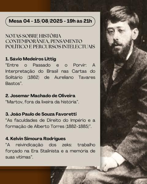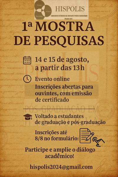 Temos a satisfação de anunciar que ocorrerá a 1ª Mostra de Pesquisas do HISPOLIS, um evento acadêmico para apresentação e discussão de pesquisas realizadas no âmbito de nosso laboratório.